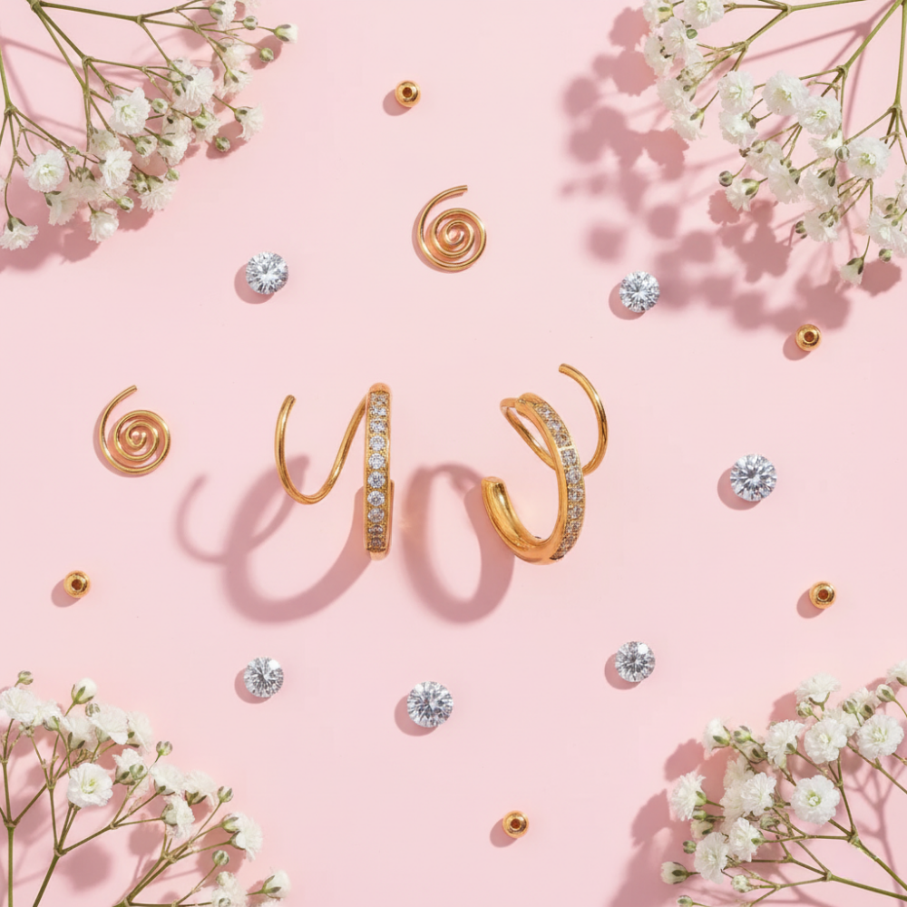 Experience the perfect addition to your jewelry collection with our Gold Ear Cuffs Set with Crystal Stones in Anti-Tarnish Stainless Steel. Meticulously crafted with premium-grade stainless steel, ensuring exceptional durability and long-lasting shine. The set includes two pairs of adjustable ear cuffs—one adorned with sparkling crystal stones and one sleek plain design—perfect for mixing, matching, or layering.