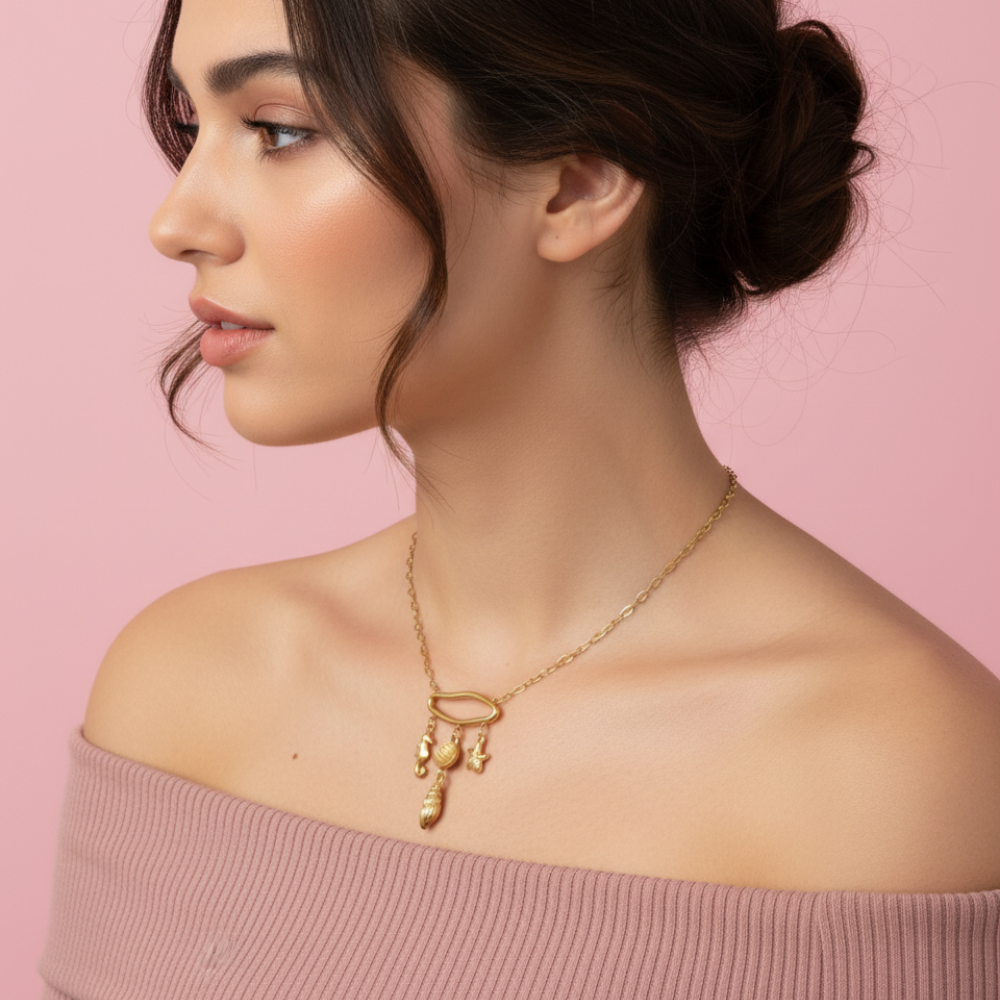 Elevate your look with the Kyeora Golden Arch Drops Necklace a modern masterpiece that combines geometric design with playful elegance. Featuring a sculptural gold-plated arch with delicate dangling charms, this piece is perfect for those who love to stand out.