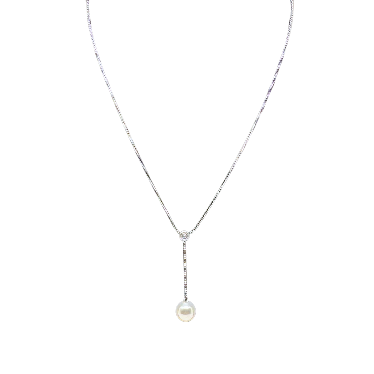 Chic and sleek, with a faint hint of retro glamor, the Kyeora Moonlight Lariat Necklace exudes an aura of effortless Hollywood cool, channeling the glam era of Holly Golightly from Breakfast at Tiffany's. Anti-tarnish stainless steel designs offer an elegant box chain that holds a cubic zirconia star capable of distracting any observer, allowing a lob-sided pearl drop to glimmer—the type of elegance exemplified by Audrey Hepburn under the city lights. Choose to put on this glamourous piece for café brunch or a study session at midnight; the necklace will take any contemporary design in an eon of timeless elegance.