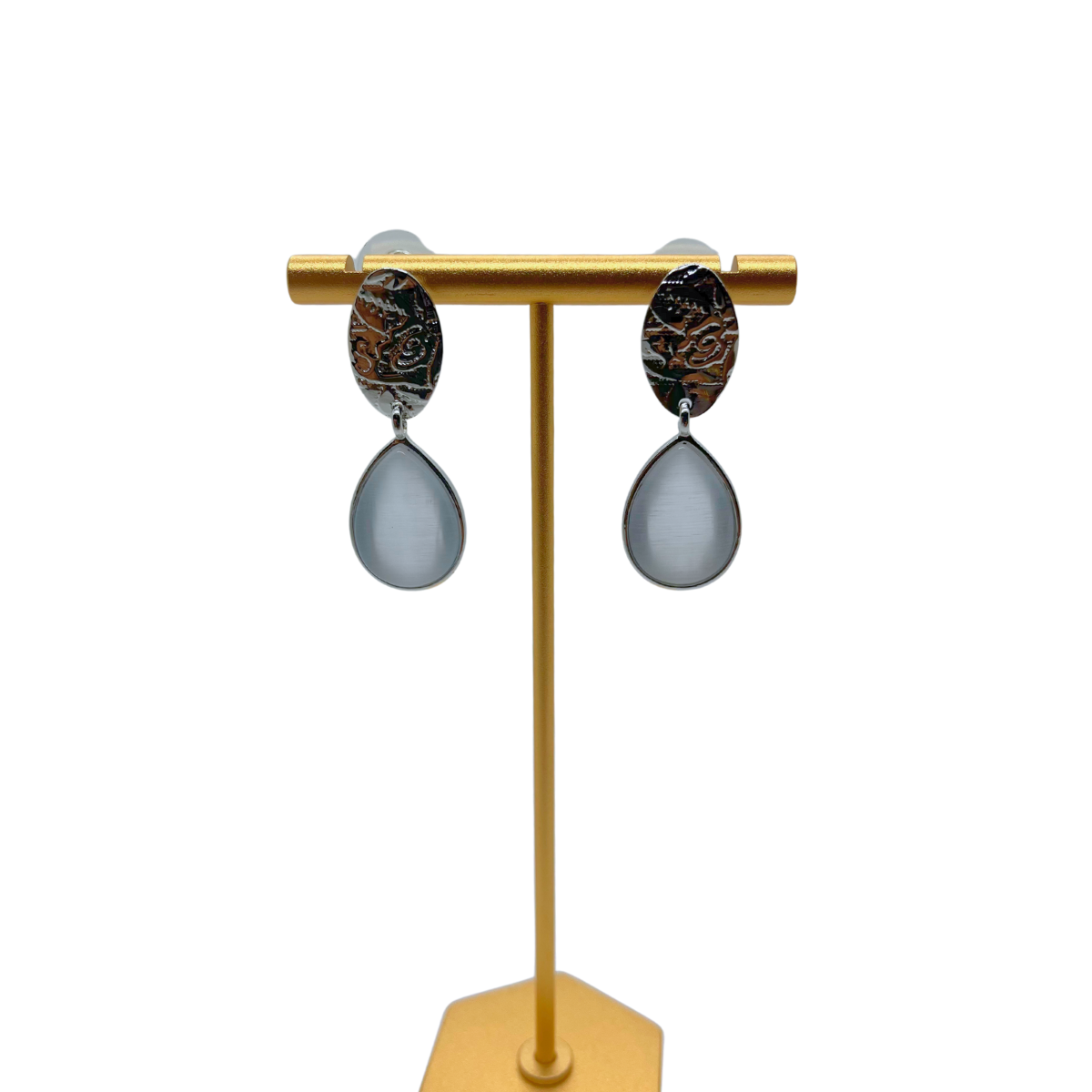 The Kyeora Sorceress's Rune Earrings will help you unleash your inner sorceress. This pair of earrings, which are the ethereal equivalent of our golden Oracle's Vision earrings, have a cool, polished silver disc that is finely carved with designs reminiscent of ancient, unknown runes. A luminous, moon-like stone dangles below, pulsing with silent strength, waiting for a magician or a destinarian.